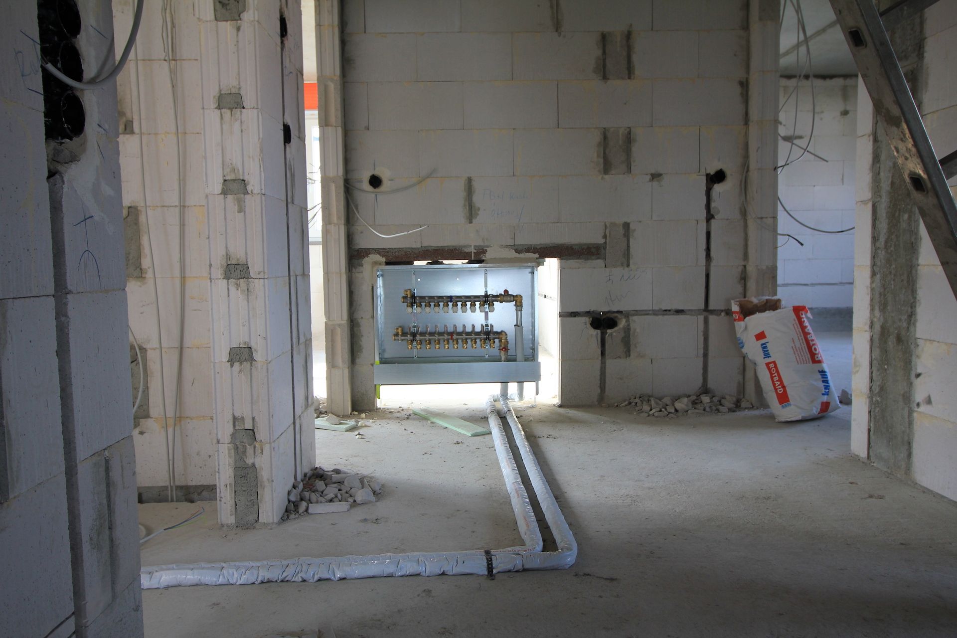 Rohinstallation im OG Flur. Der Heizungsverteiler wurde schon angeschlossen.